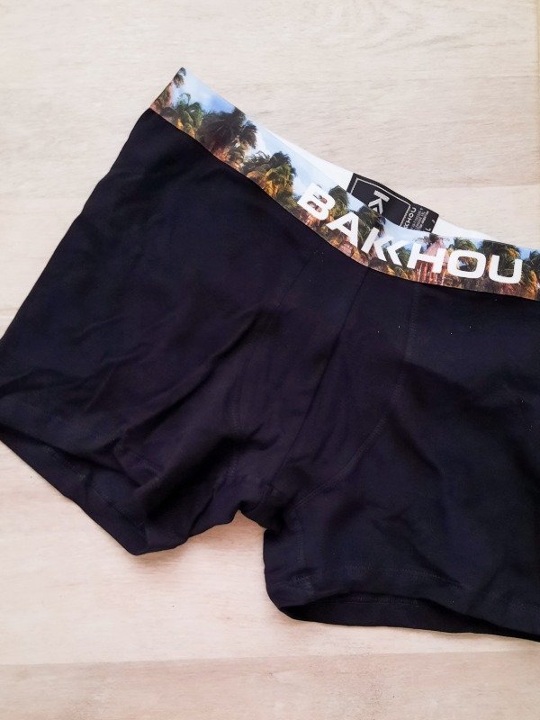 Boxer de algodón lycra liso con elástico logo BAKHOU con fondo palmeras.