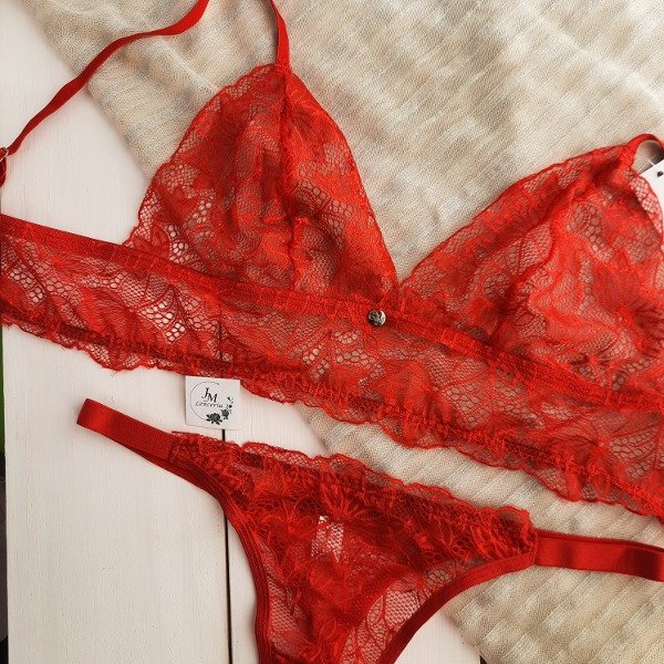 Conjunto de puntilla.Corpiño triangulito y colaless regulable