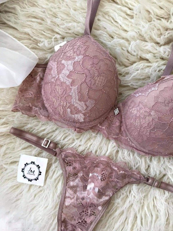 Conjunto de puntilla. Corpiño push up soft con dije romboide strass y colaless.